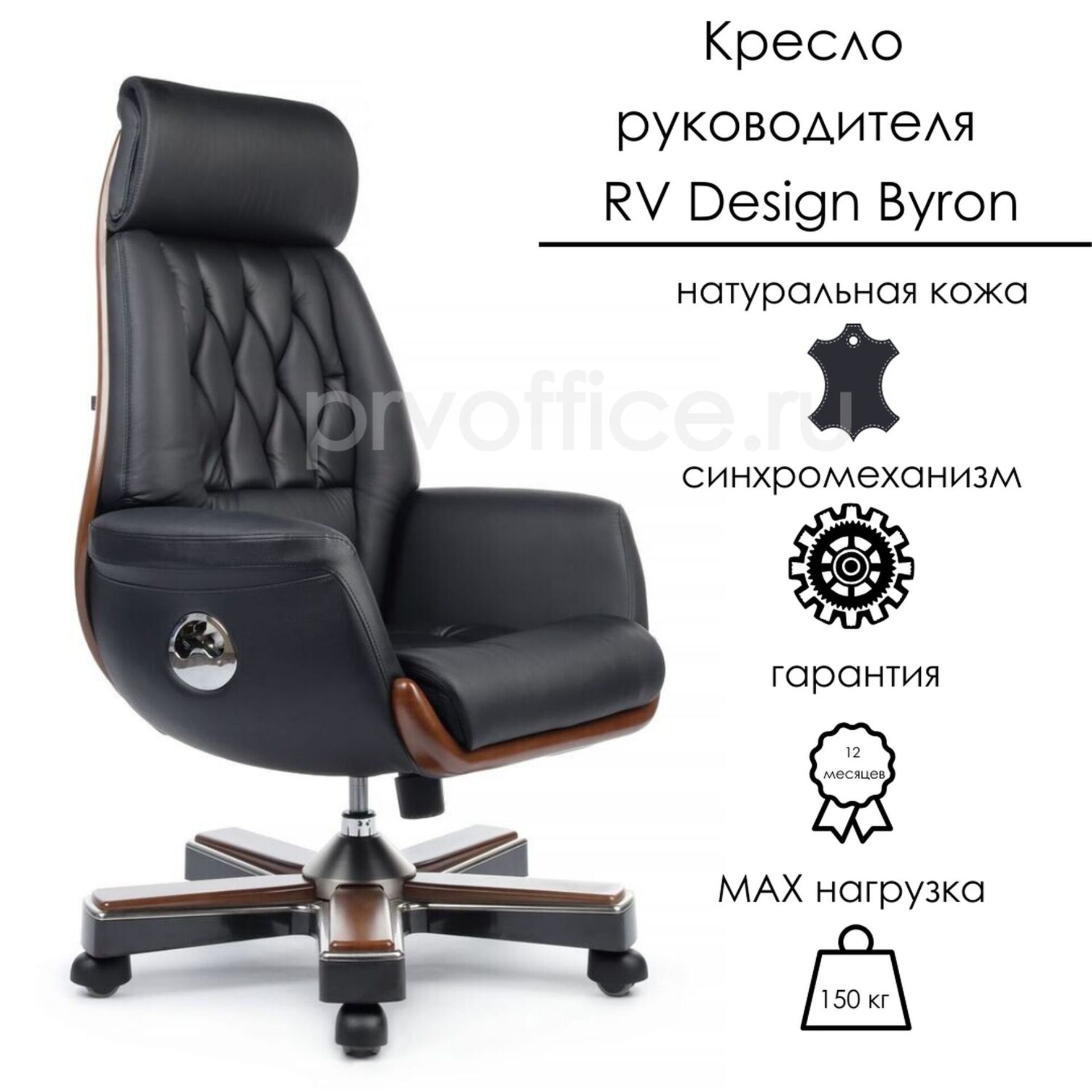 Кресло руководителя премиум-класса RV Design Byron - невероятно удобное офисное кресло из натуральной кожи. Комфорт, обтекаемые формы и эффектный дизайн кресла Byron несомненно придутся по вкусу ценителям классического стиля в интерьере, а вставки, имитирующие натуральное дерево, добавят благородности вашему пространству. Встроенный синхромеханизм свободного качания обеспечит фиксацию кресла в пяти положениях, а эффект "анти-шок" позволит избежать удара или неожиданного "опрокидывания" спинки при снятии блокировки. Предельная нагрузка - 150 кг.