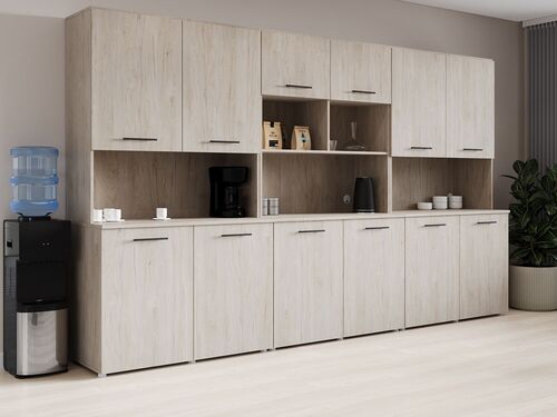 Внешне офисная кухня – это комплект компактной мебели, которая сочетает эргономичность и функциональность. Мебельный набор решает ряд задач:
