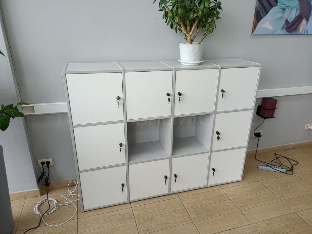 Для хранения личных вещей сотрудников была предложена серия мебели Locker Plus – универсальные шкафчики для хранения с персональным замком для каждого сотрудника. Применив комбинацию белого и серого ЛДСП в локерах, получилось выдержать общий вид call-центра, сочетав их с рабочими станциями.